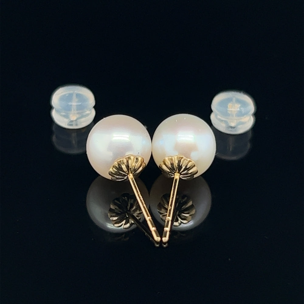 8.5 mm Akoya pearls with incredible luster on 18k yellow gold studs.