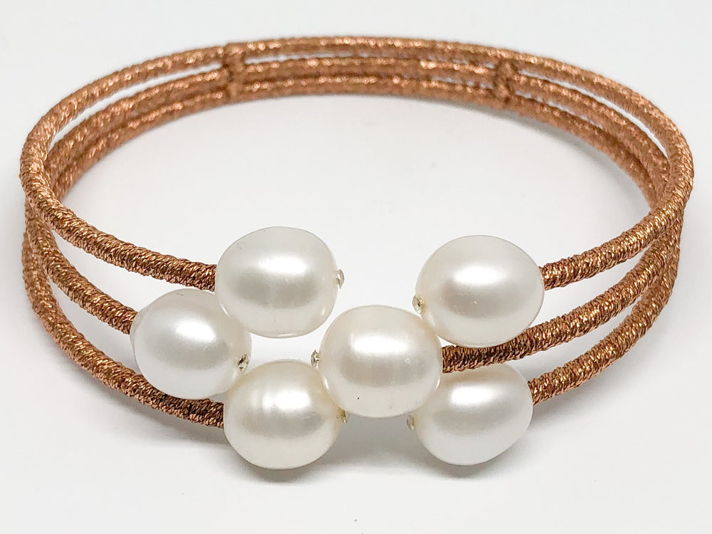 Six white freshwater pearls on a wire bracelet with a very fine copper wrap.