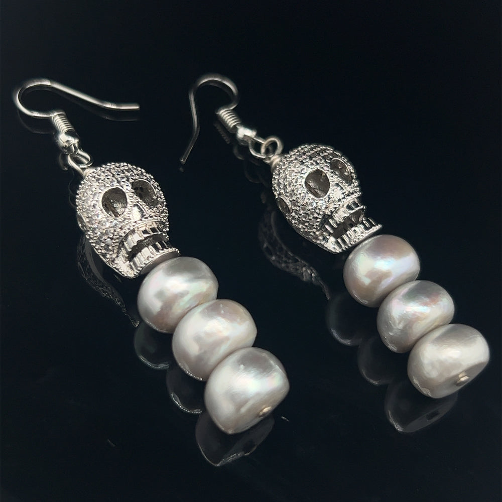 A pair of cubic zirconia-encrusted skulls rest upon iridescent gray freshwater pearls (dyed). In sterling silver.