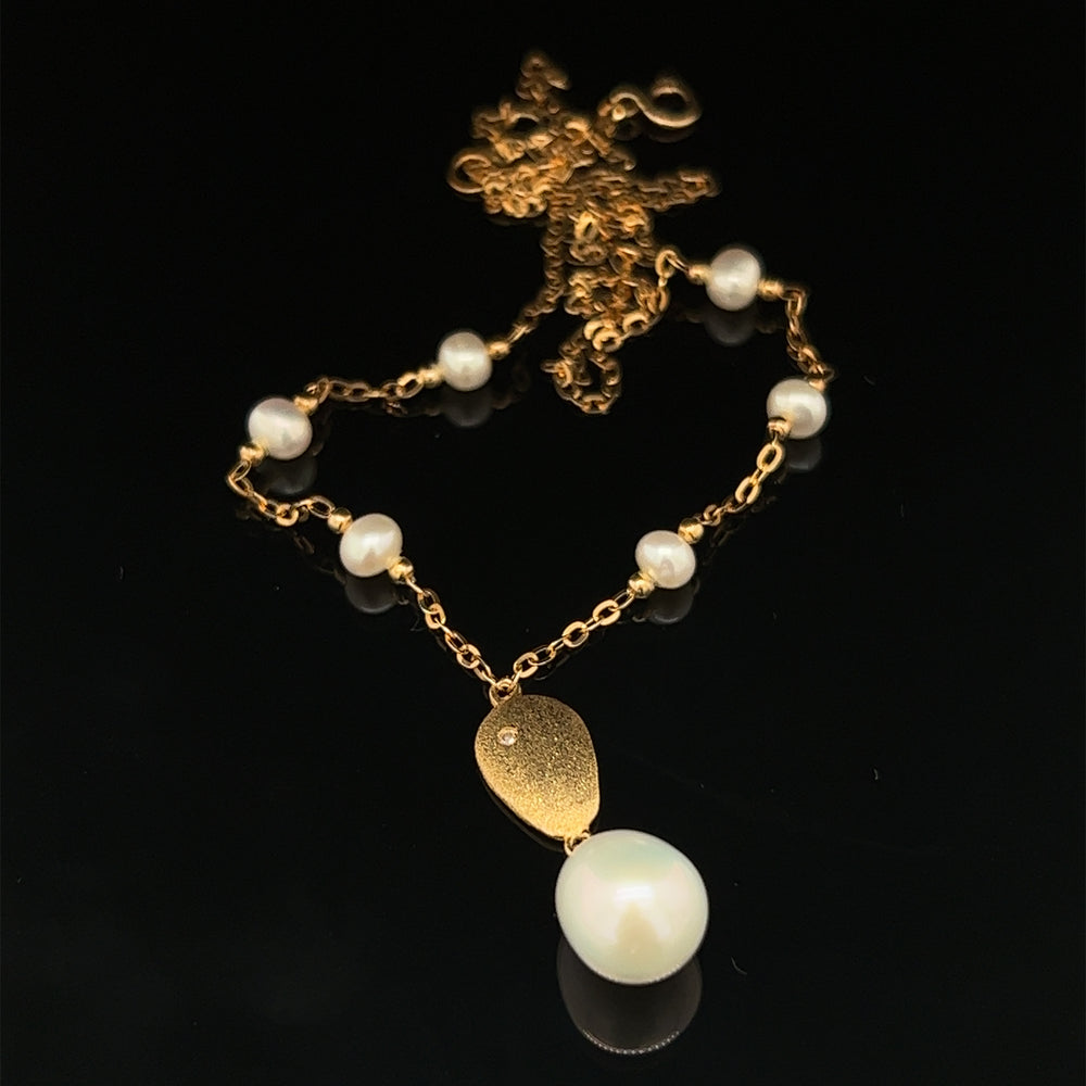 A lovely 14k yellow gold drop necklace featuring an 11mm freshwater pearl with a small diamond accent piece below six 4.5mm pearls in station. 16.5-17.5 inch adjustable length.