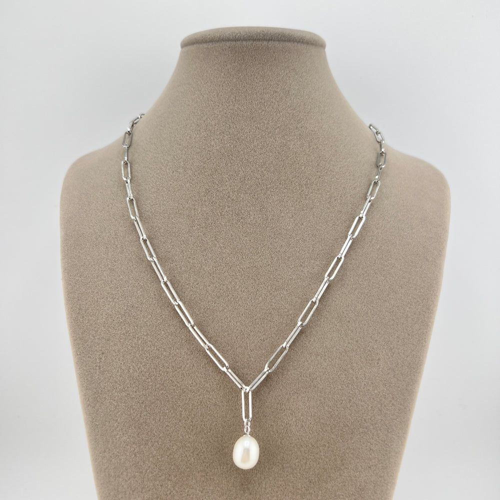 An 18 inch sterling silver paperclip chain centered by a 9mm freshwater pearl. This modern twist on a classic style would be a great addition to a stack or as an every day staple.