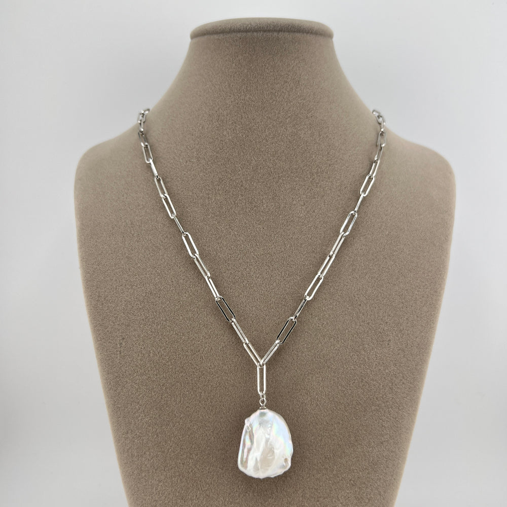 An 18 inch sterling silver paperclip chain centered by a large baroque freshwater pearl.