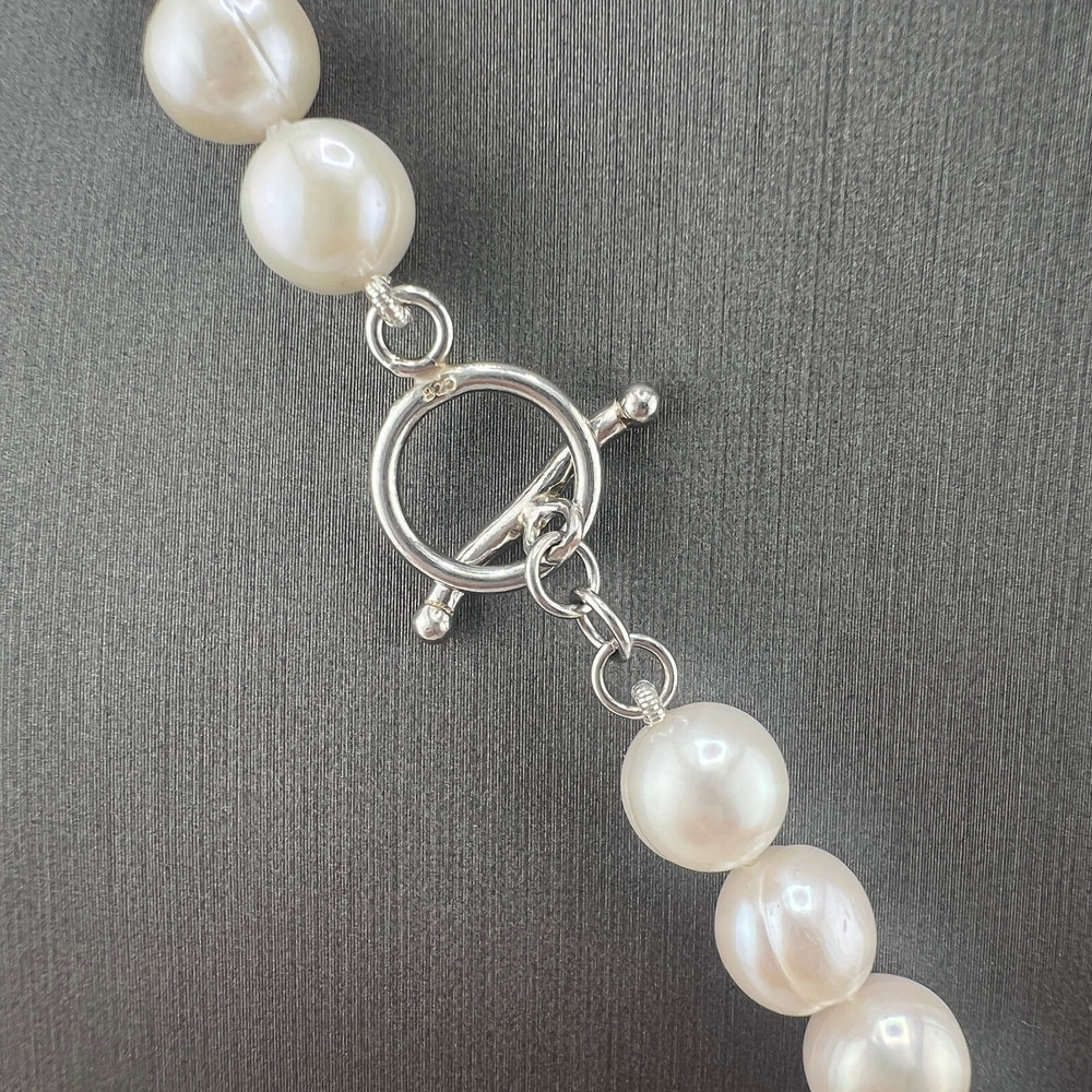 A lovely 35 inch long freshwater pearl necklace on a sterling silver toggle clasp.