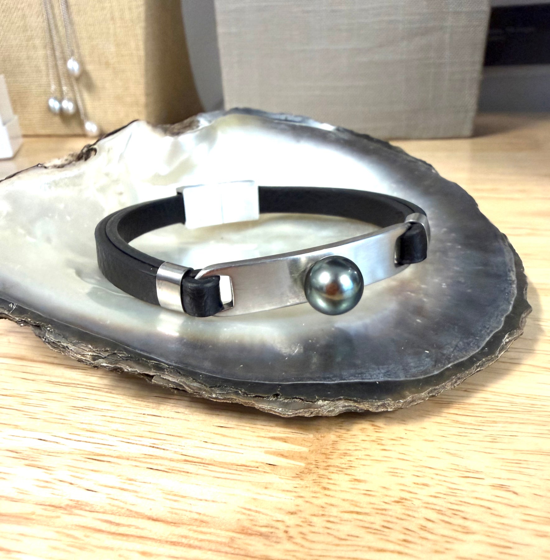 For men who love pearls as much as I do! Masculine leather and brushed stainless steel. This piece is one of a kind and boasts a gorgeous 8mm Tahitian black pearl with amazing green overtones. 8". Pictured on my arm which is smaller than most men... thus it's a bit big on me.