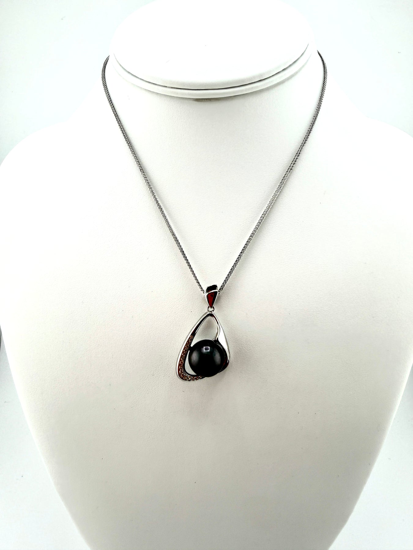 A Tahitian "Black Pearl" pendant necklace presented with sparkling white topaz (nope, not CZ), crafted of 925 sterling silver, rhodium plated to avoid tarnishing. This is a 12mm Tahitian, dark grey pearl. The necklace is also sterling silver and is adjustable up to 22".