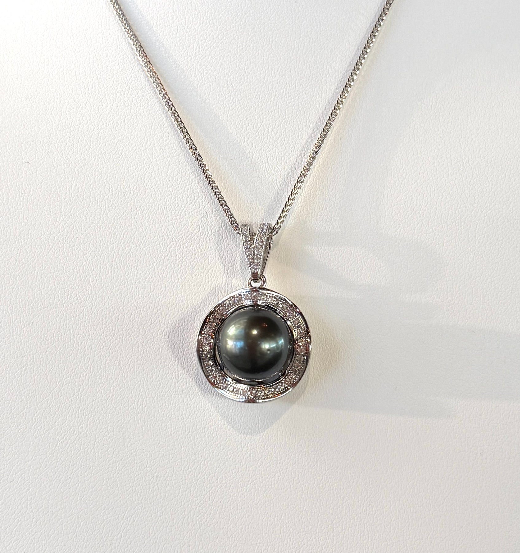 A Tahitian "Black Pearl" pendant necklace presented with sparkling white topaz (nope, not CZ), crafted of 925 sterling silver, rhodium plated to avoid tarnishing. This is a 12mm Tahitian, dark grey pearl. The necklace is also sterling silver and is adjustable up to 22".