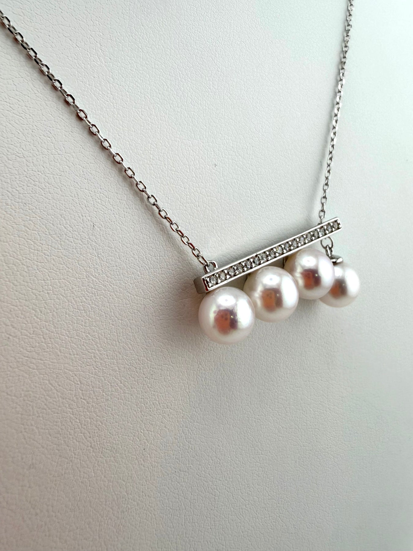 Four beautiful, exceptionally lustrous Japanese Akoya pearls with one slightly suspended from a pendant bar crafted of 925 sterling silver and white topaz. The necklace can be worn at 16" or 18". The 7mm pearls are white with a slight hint of pink.