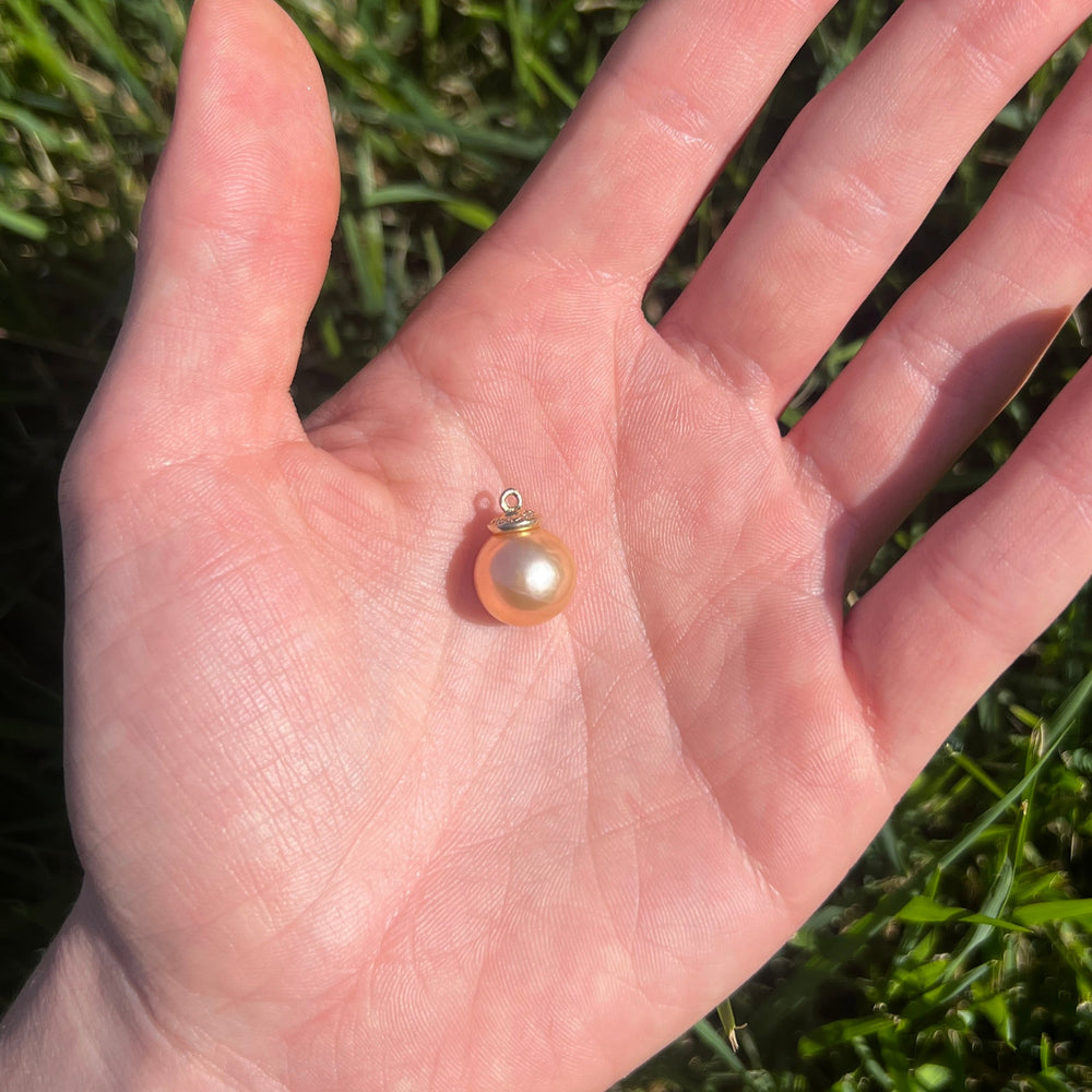 A beautiful peachy pink Edison pearl on a 14k yellow gold diamond bail. The pearl is perfectly round with mild blemishes and measures 12 mm.
