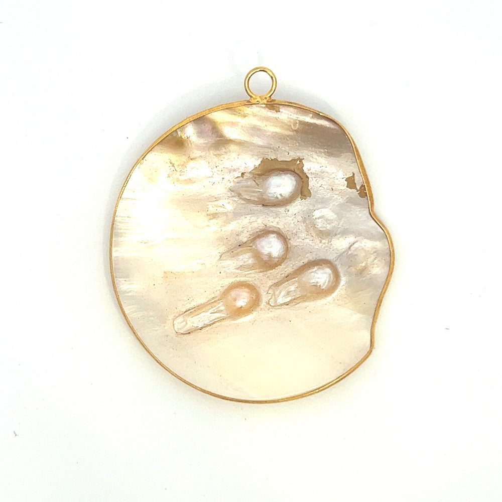 A unique bezel set blister pearl pendant. Approximately 2.5 inches tall.