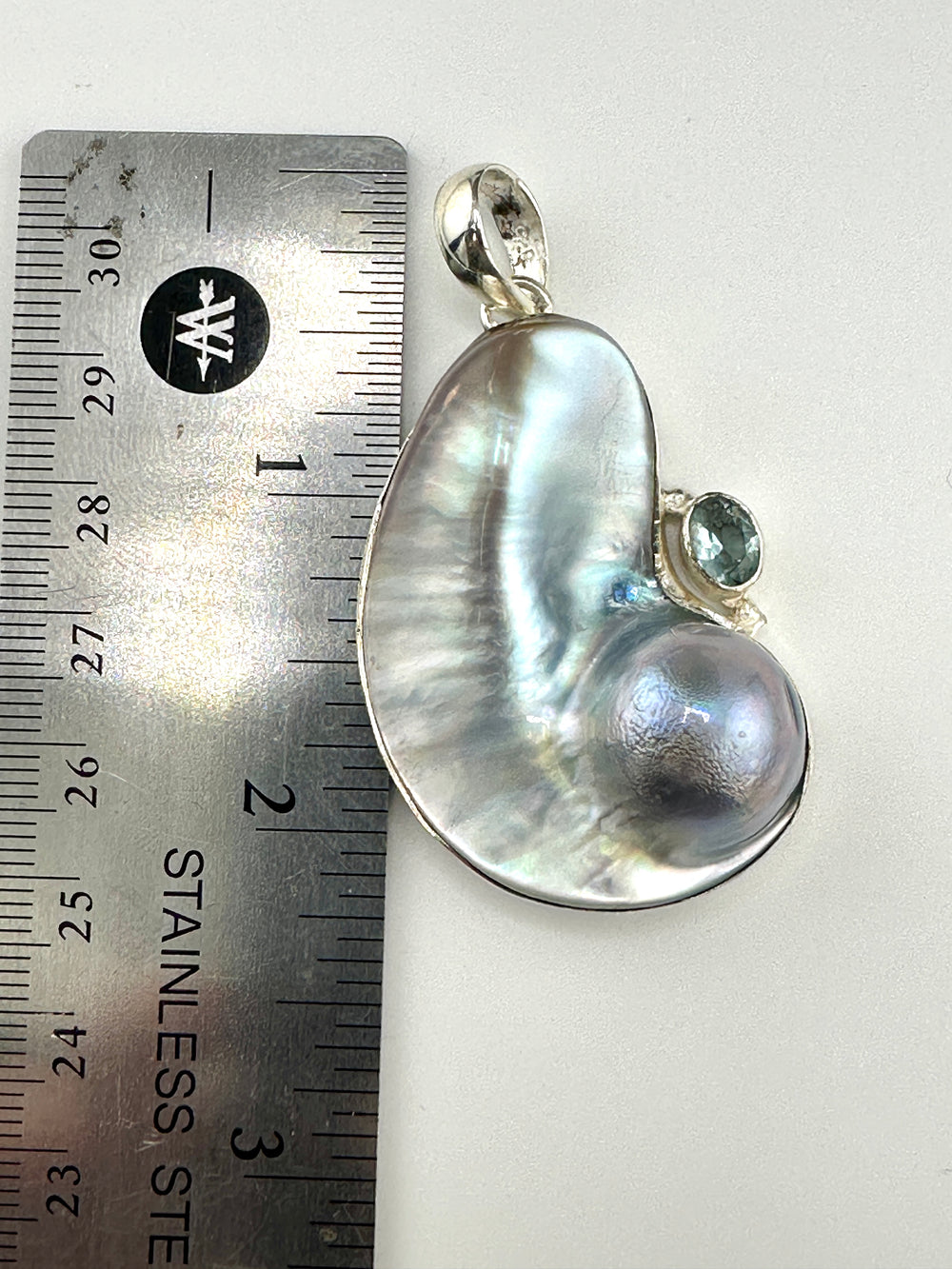 This large mabe pearl set in 925 sterling silver will make for a terrific statement piece and will stand out against white or bring out pretty much any color you wear. Set with a small oval shaped faceted aquamarine . See photos for size. One of a kind!