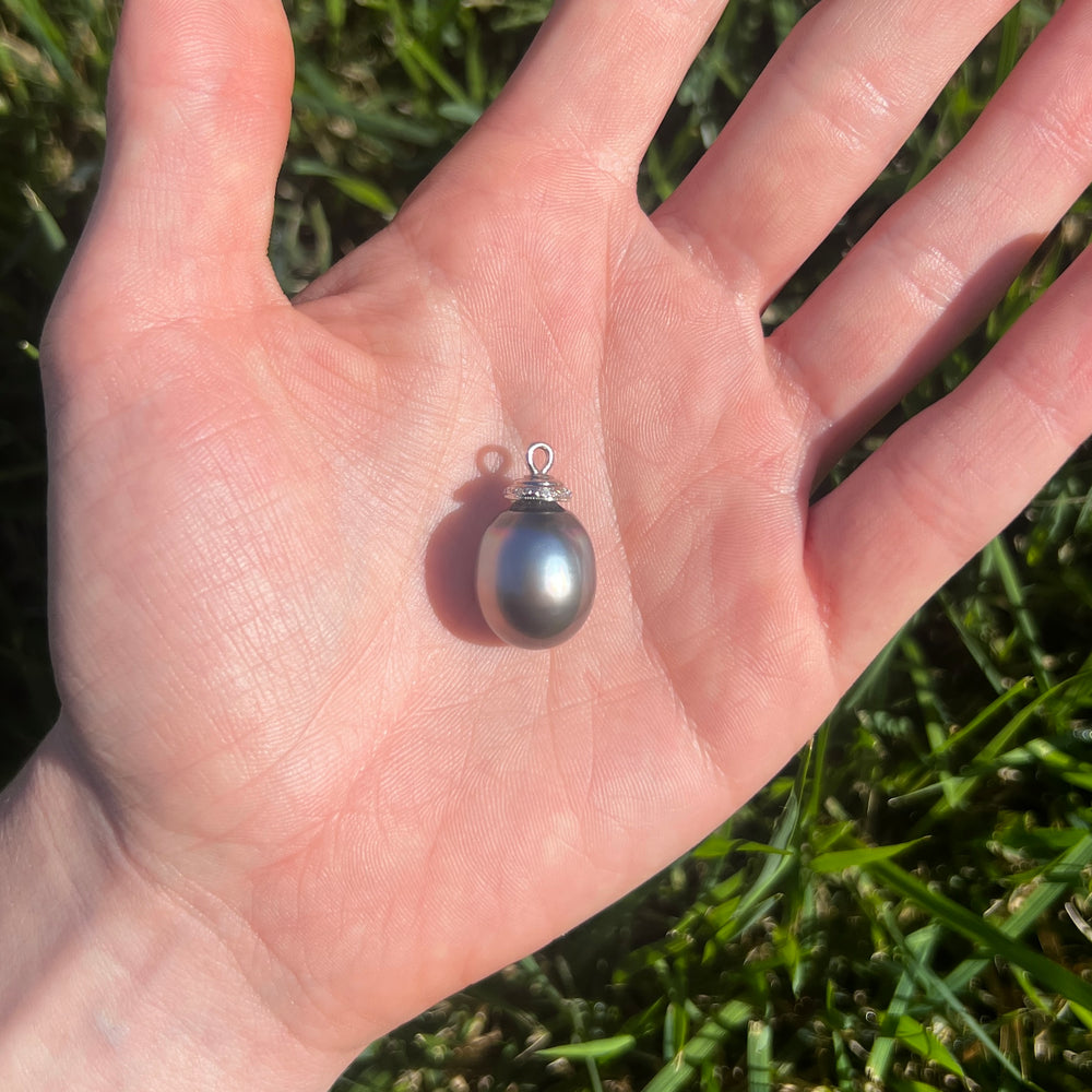 A beautiful gray Tahitian pearl on a 14k white gold with diamonds pendant. The large pearl makes a statement measures 20x15mm, with good luster and hues of blue, green and purple. Wear it on a simple silver or white gold chain - for both men and women. I wear a large Tahitian every day and it's always a conversation piece! ~Matt